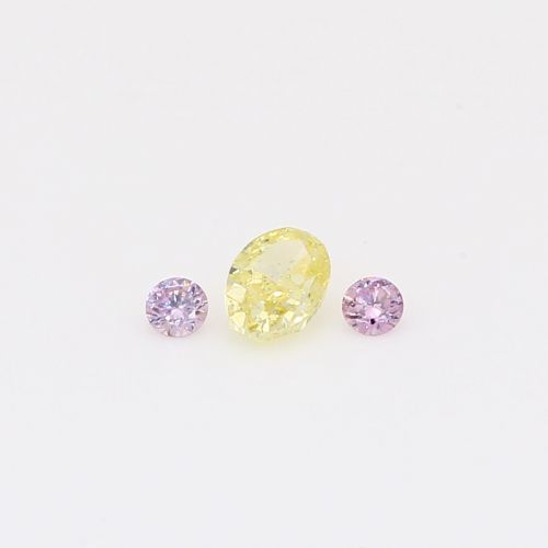 This 0.28 total carat diamond trio features a 0.21 carat oval-cut fancy light yellow diamond, paired with two FPU purple diamonds. The rosy and golden hues beautifully complement one another, creating a warm, romantic contrast that's perfect for a bespoke diamond ring or pendant design.