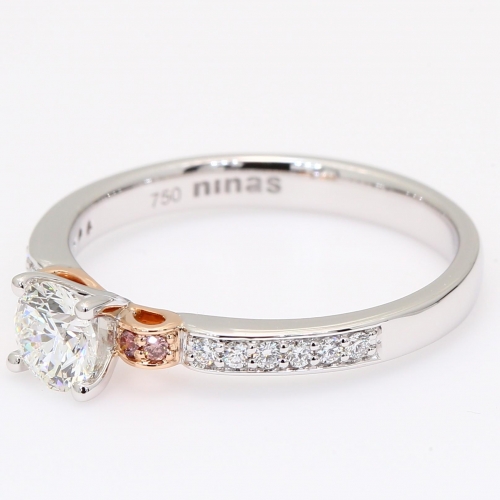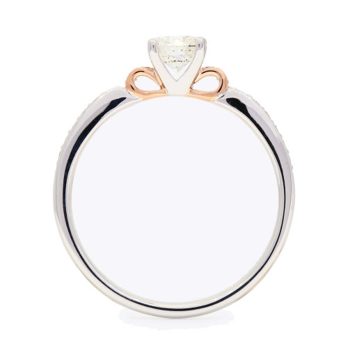 Crafted in 18 karat rose and white gold, the Anastasia diamond ring centres on a stunning GIA-certified round-cut white diamond of just over half a carat, secured in a refined four-prong setting, while each shoulder is adorned with a round-cut Argyle light pink champagne diamond, accompanied by an Argyle Lot Number for complete authenticity and set in warm rose gold to enhance its blush tones and create a soft, romantic contrast to the brilliance of the centre stone, from the side profile a whimsical surprise reveals itself as two graceful scrolls of rose gold curve like silken ribbons beneath the setting, forming an elegant bridge between the centre diamond and the shimmering white diamond channel-set band, making the Anastasia diamond ring a timeless expression of femininity.