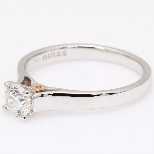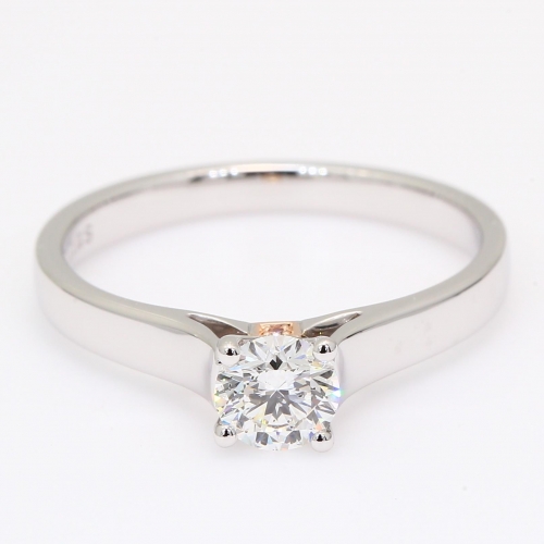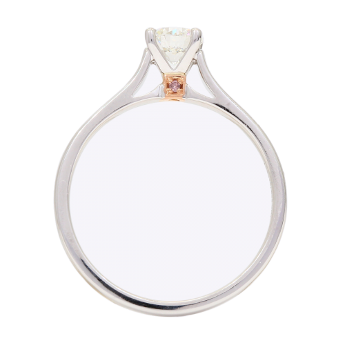Crafted from 18 karat rose and white gold, the Annabella diamond ring is a beloved solitaire design with an elegant twist and elevated rose upgrade. The focal point is the just over half carat GIA certified white diamond, set in a refined four claw setting. The side profile reveals an enchanting cathedral solitaire where a blush of 18 karat rose gold at the bridge cradles a petite, flush claw-set light pink champagne diamond accompanied by an Argyle Lot Number for complete authenticity, sparkling like a hidden treasure on either side and adding a touch of feminine magic beneath the soaring arches of the ring's silhouette.