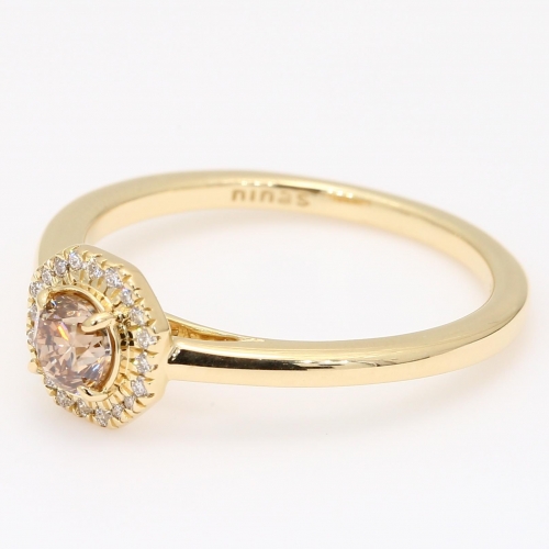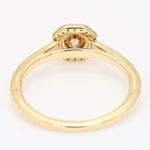 Set in warm 9 karat gold, the Apiary diamond ring celebrates a single 0.39 carat champagne diamond in a hexagonal halo. Surrounded by 20 fine white diamonds to enhance its warm latte and honey hues, this champagne diamond ring is a modern take on the traditional halo.