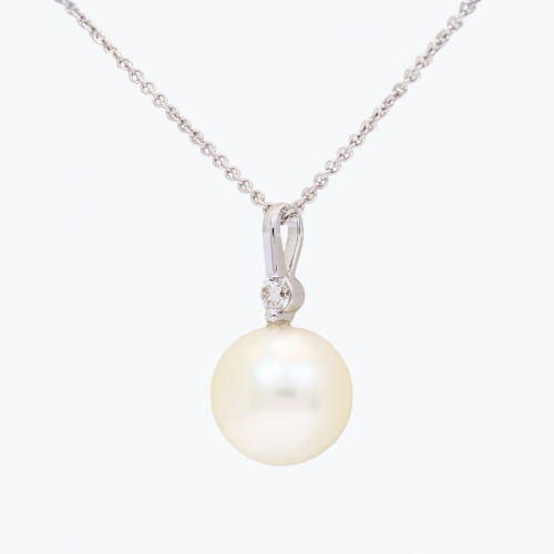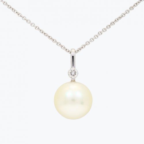 The Caspian necklace combines treasures from the land and sea, boasting an alluring 8- 9mm South Sea pearl accompanied by a 0.07 carat round-cut white diamond. A hand-selected match that elevates a classic pearl necklace into a spectacular showstopping piece. Matching earrings are available.