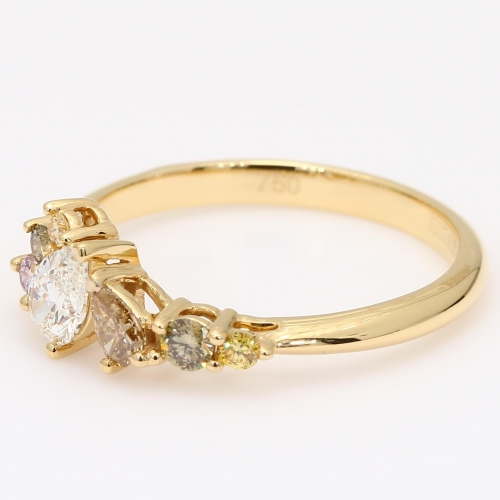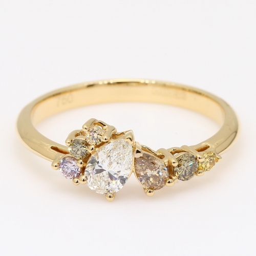 The Celebration IV pear-cut and round-cut rainbow diamond ring is a lively display of natural coloured diamonds. At its centre rests a pear-cut white diamond of nearly half a carat, enhanced by a joyful array of colour claw set around it and partially along the band. The assortment includes an Argyle fancy light pink diamond accompanied by an Argyle Lot Number for complete authenticity, a pear cut C6/7 champagne diamond, a fancy green diamond, a fancy yellow diamond and a fancy purple diamond, each accented by a round-cut diamond. Crafted in 18 karat polished yellow gold with rose and yellow gold claws to highlight each stones natural hue, this statement ring captures the beauty of fancy coloured diamonds in a bold yet graceful composition.