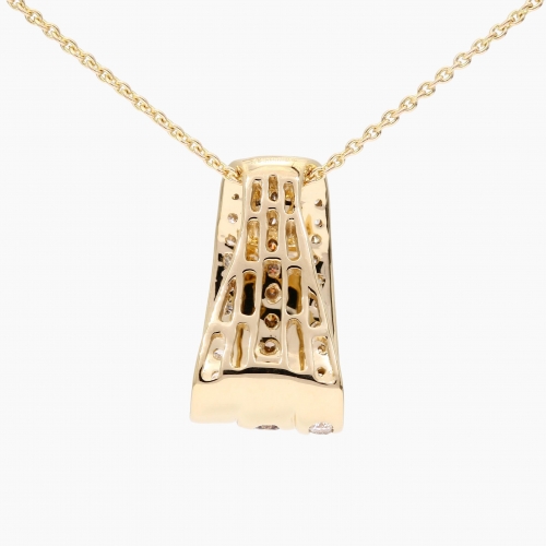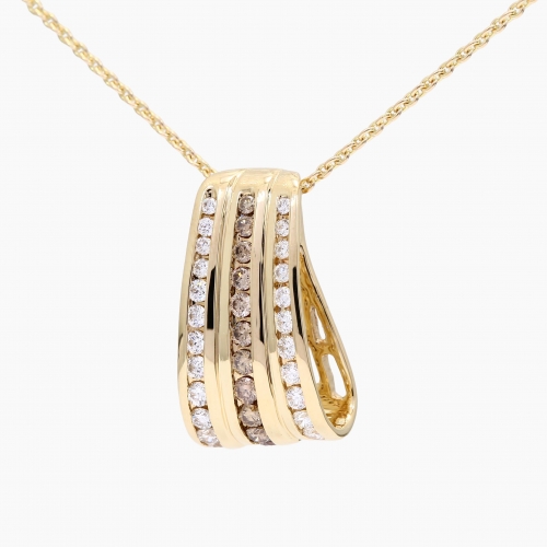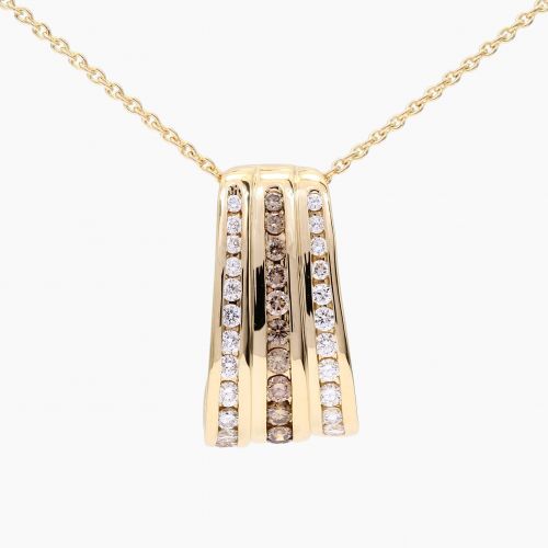 Inspired by the bold lines and glamour of Art Deco architecture, the Chrysler necklace is a stunning showcase of sparkle and structure. Featuring a refined three-tiered channel design, each earring is set with 11 C6/7 diamonds, two outer rows of white diamonds gently framing a centre row of champagne diamonds. Crafted in high-shine 9 karat yellow gold, the layered silhouette echoes the stepped form of its namesake. A contemporary design with a modern allure. Matching set available.