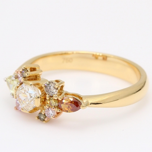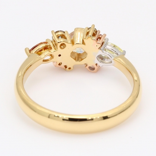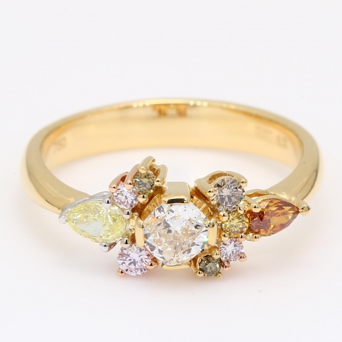 The Cleopatra rainbow diamond ring exudes ethereal elegance and soft romantic charm. Crafted in 18 karat high-shine yellow, rose, and white gold, it features a 0.42 carat cushion-cut white diamond at its centre. Almost entirely surrounding the centre stone is a beautifully curated assortment of round-cut Argyle fancy light pink diamonds, accompanied by an official Argyle Lot Number for complete authenticity, alongside a round-cut fancy purple diamond, round-cut fancy green diamonds, and a round-cut C3/5 champagne diamond. Two additional pear-cut diamonds, a fancy orange and a fancy yellow diamond are positioned horizontally on the band to enhance the design and create a balanced, flowing composition. Each stone is expertly claw set to maximise sparkle, resulting in a captivating rainbow diamond ring that combines colour, luxury, and artistry in one unforgettable design.