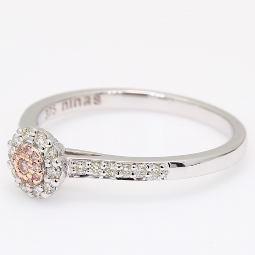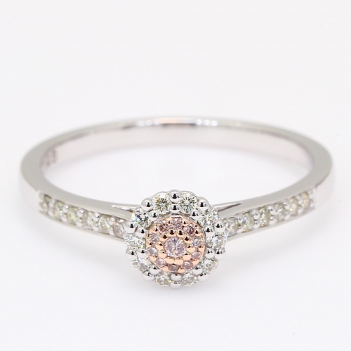 Crafted in 18 karat rose and white gold, the Elodie diamond ring is an enchanting two-tone double halo design that captures a moment of pure romance. At its heart, rare Argyle light pink champagne diamonds, accompanied by an Argyle Lot Number for complete authenticity, are set in warm rose gold and surrounded by a halo of white diamonds, finished with a shimmering channel-set band. This ring is a timeless celebration of soft, rosy hues and refined elegance.