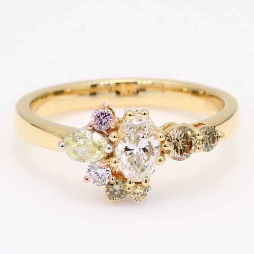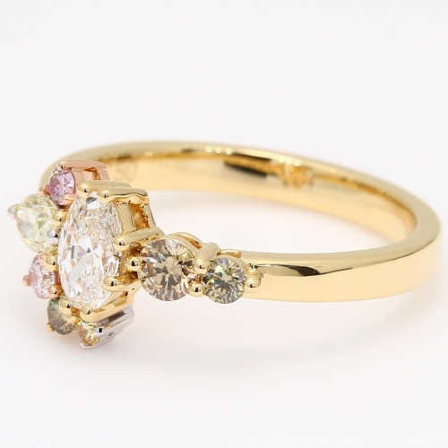 The Frolic I rainbow diamond ring is a vibrant burst of colour paired with a crisp, classic oval-cut white diamond. The nearly half-carat oval-cut diamond commands attention, complementing the rainbow hues with perfect harmony. Crafted in 18 karat rose, white, and yellow gold, the ring showcases a spectrum of colour, including an Argyle fancy purplish pink diamond accompanied by an Argyle Lot number for complete authenticity, as well as a fancy apricot diamond, a fancy purple diamond, a fancy yellow diamond, a fancy green diamond and a C3/5 champagne diamond. This striking combination creates a unique blend of colour and elegance, making it a truly exceptional addition to any fine jewellery collection.