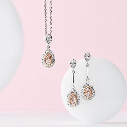 Crafted from a contrasting combination of 18 karat white and rose gold, these beautiful droplets are encrusted with precious treasures. Featuring Argyle light pink champagne diamonds accompanied by an Argyle Lot Number for complete authenticity and 0.22 total carats of round-cut white diamonds, the Indira droplet earrings are a lavish celebration of natural coloured sparkle. Also available in a matching pendant.