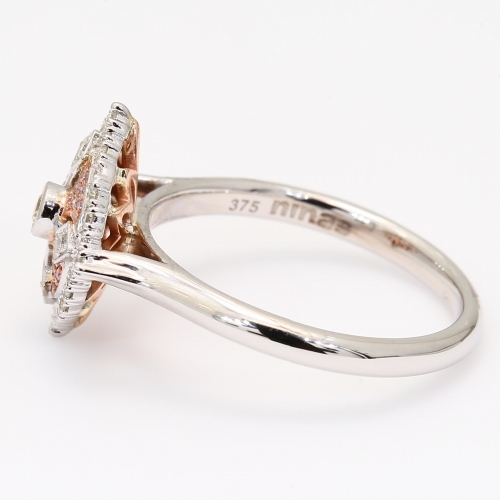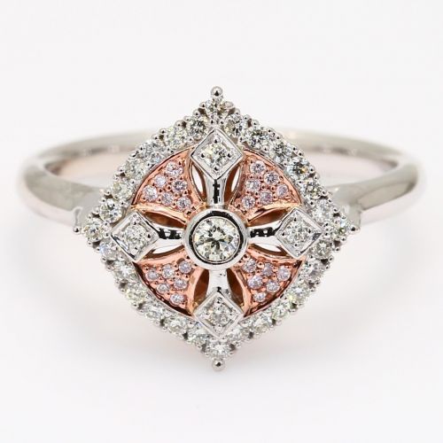 Crafted from 9 karat rose and white gold, the Marietta ring features an intricate pave-mosaic of rare Argyle light pink champagne diamonds around a white diamond set cross detail. Finished with a glittering white diamond halo, this ornate, vintage-inspired diamond ring is also available in a matching earring and pendant.
