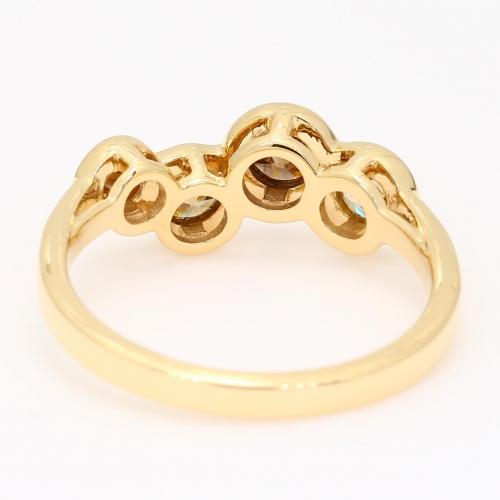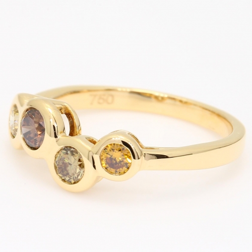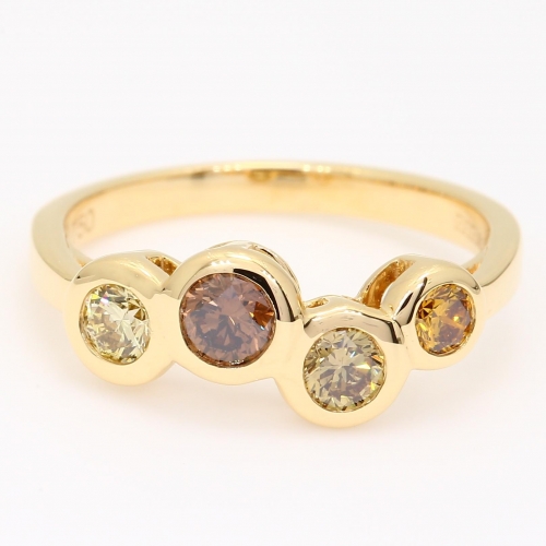 The Orbelle diamond ring is a bezel-set band with a bold twist. Each brilliant round-cut diamond is secured in high-shine 18 karat yellow gold bezels. The curve is formed by the setting of the bezels, giving the piece a soft, elegant curve that enhances its beauty. This striking design features a vibrant mix of rare natural diamonds, including a 0.20 carat fancy yellow diamond, a 0.26 carat C6/7 champagne diamond, a 0.20 carat fancy green diamond, and a 0.12 carat fancy orange diamond. Each playing its part in creating a colourful display of brilliance.