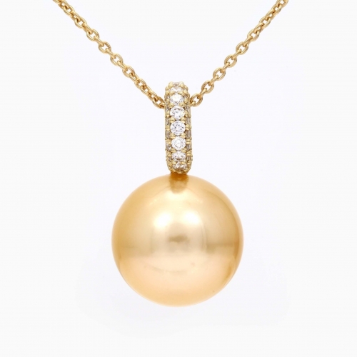The Praia South Sea pearl and diamond necklace features a breathtaking 9-10mm, medium-high-lustre gold South Sea pearl. Secured to a diamond-encrusted, round feature-bail of 9 karat yellow gold. Complete your look with this stunning piece of aquatic beauty that longs to be paired with matching earrings.