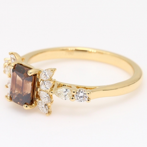 The Rivera emerald and marquise-cut champagne and white diamond ring is a striking harmony of warm celebratory sparkle and refined feminine design. At its heart sits a 1.02 carat emerald-cut C6/7 champagne diamond, accompanied by an Argyle Lot Number for complete authenticity. On either side, four marquise-cut white diamonds create symmetry and brilliance, while the band is further adorned with two pear-cut white diamonds and a round-cut diamond on each side. This exquisite composition is crafted for those who value sophistication with a touch of warmth.