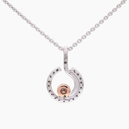 The Rune diamond necklace is crafted from 9 karat white and rose gold, featuring an elegant near-circle design with an elongated bail for a refined drop. At its centre sits a bezel-set, round-cut PC1-PC3 Argyle champagne diamond, accompanied by an Argyle Lot Number for complete authenticity. The piece is completed with nineteen white diamonds that create a crisp, radiant border. 40-45cm Chain included.