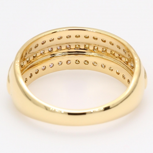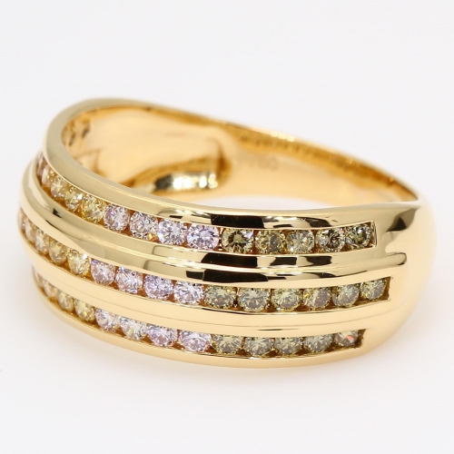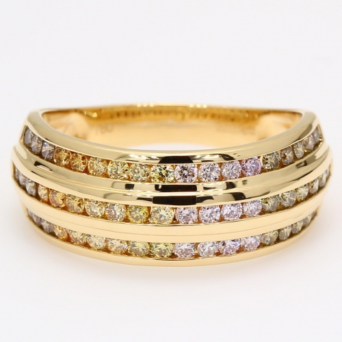 The Valentina rainbow diamond band is a bold and beautiful design, crafted from 18 karat high-shine yellow gold. Three channel-set rows of round-cut diamonds create an elevated rainbow sparkle across the band. Each row forms its own radiant rainbow, showcasing four round-cut Argyle light pink champagne diamonds accompanied by an official Argyle Lot Number for complete authenticity, four round-cut fancy purple diamonds, four round-cut C6/7 champagne diamonds, four round-cut fancy green diamonds, four round-cut fancy orange diamonds, four round-cut fancy yellow diamonds, and four round-cut fancy apricot diamonds. A striking rainbow diamond band, perfect for stacking or worn alone as a statement piece.
