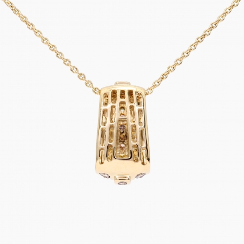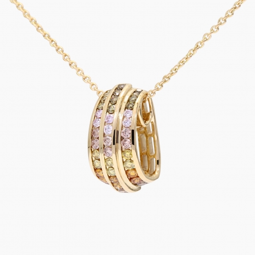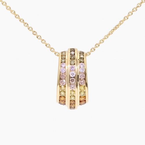 The Valentina rainbow diamond necklace is a beautifully colourful design crafted from 9 karat high-shine yellow gold. Three channel-set rows of round-cut diamonds form an extraordinary rainbow sparkle. In vertical gradients of colour this piece showcases six round-cut Argyle light pink champagne diamonds, accompanied by an official Argyle Lot Number for complete authenticity, six fancy purple diamonds, six fancy orange diamonds, six fancy yellow diamonds, seven C3/5 champagne diamonds and twelve fancy green diamonds. This striking rainbow diamond design is part of a matching set.