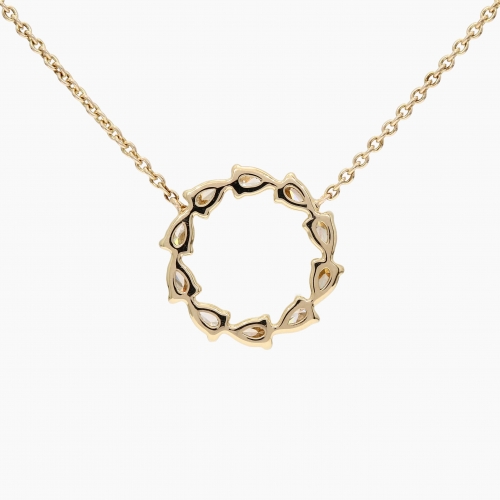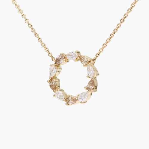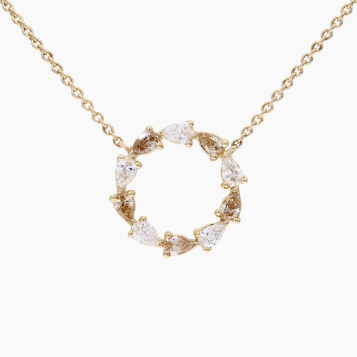 Set with ten fine white and C3/5 champagne pear-cut diamonds, the Wreathe champagne diamond necklace is the contemporary way to wear your halo! Crafted from 9 karat yellow gold, this diamond necklace is endless natural sparkle for the modern woman. 40-45cm Chain included.
